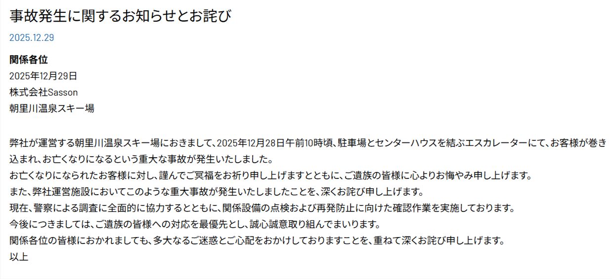 スキー場を運営するサッソン株式会社は、事故について公式サイト上で「お客様がエスカレーターに挟まれて死亡する重大事故が発生した」として謝罪し、原因究明と再発防止に努めると表明しています。
