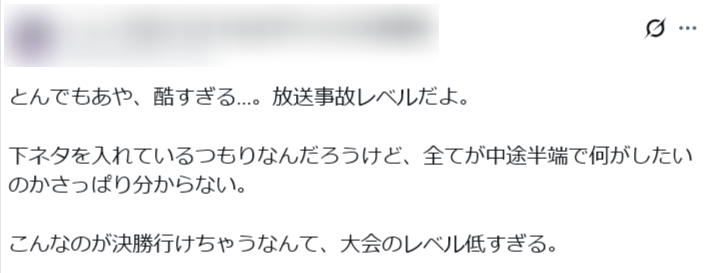 • その一方で、「芸歴や生き様」をもっと感じさせるところが欲しかったというニュアンスの指摘もしており、ネタ自体には魅力を認めつつも、キャリアや背景が作品としてまだ足りないとコメント。