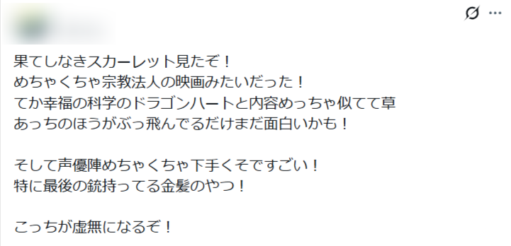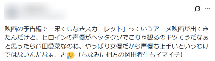 全体的に『果てしなきスカーレット』が評価を下げている要因に、主要キャストの声優が下手といわれています。