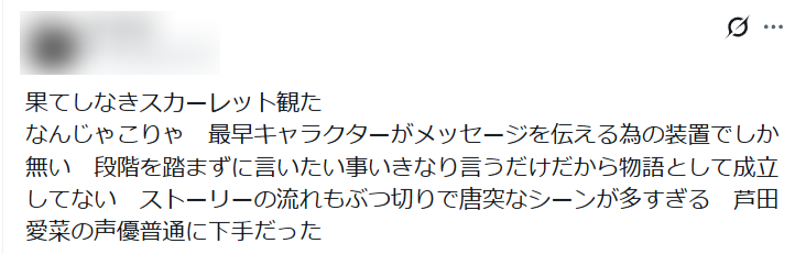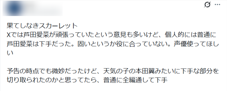 特に、主役のスカーレット役を演じた芦田愛菜さんに対して厳しい評価が多いです。