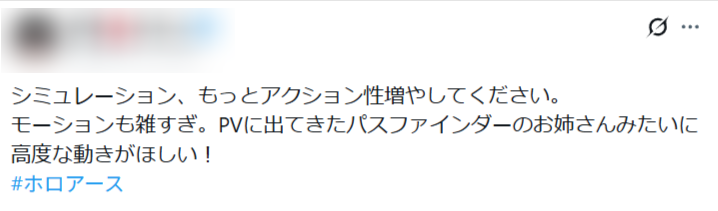 また待機モーションが1種類のみで味気なく、しゃがみ動作が不自然で、崖登り不可による移動の不便さもストレス要因とのことです。
