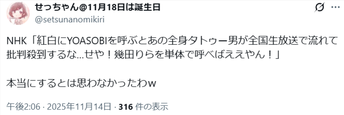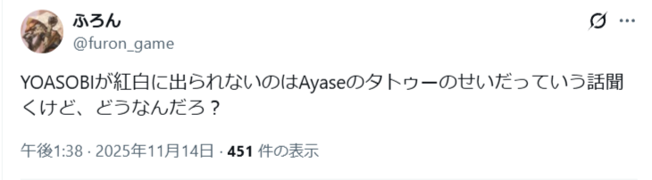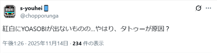 昨年のYOASOBI落選で、タトゥーの噂が広まってしまった可能性があります。