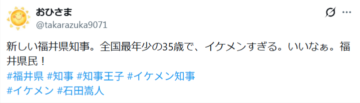 新たな新知事誕生で、注目を浴びている石田さんの今後に期待ですね!
