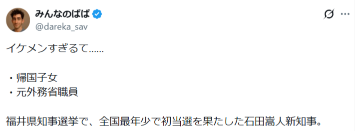 石田さんは元外務省職員で、在ザンビア大使館三等書記官・在メルボルン総領事館副領事などでキャリアを積み、外務省退職後に福井県知事選挙に出馬し見事当選しました。