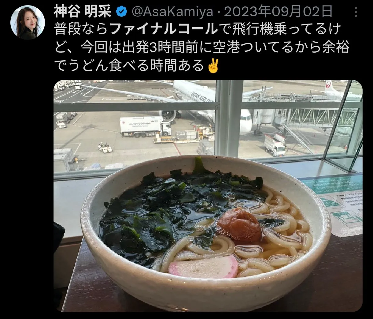 神谷明采が乗っていた飛行機は何?