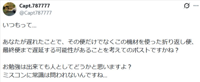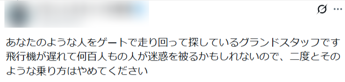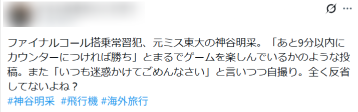 内容は、飛行機にファイナルコールで駆け込み搭乗していることをSNSで公開したことで、批判が集まっています。