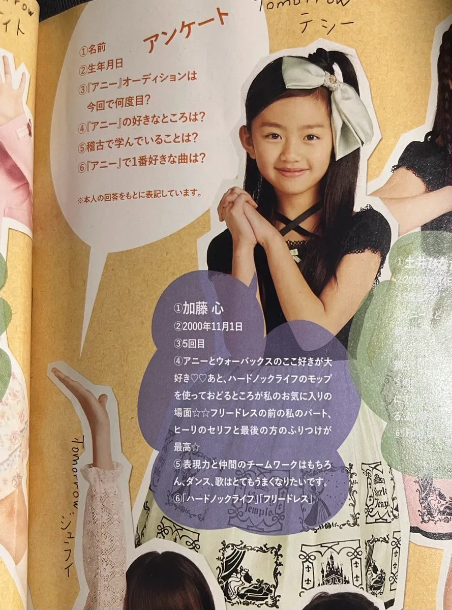 加藤さんは2011年に、ミュージカル『アニー』でトゥモロー組テシー役で子役デビューしました。