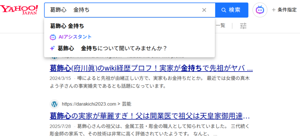 ネットで「葛飾心」と検索すると「実家」「金持ち」という検索が出てきます。