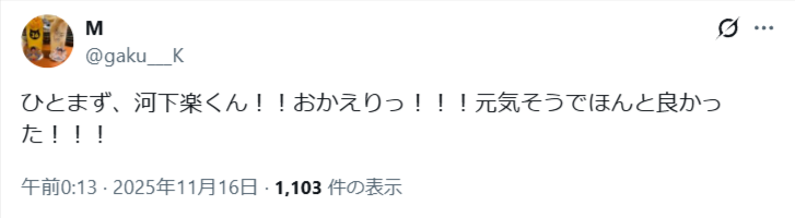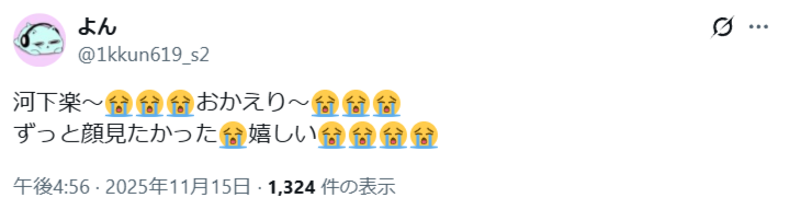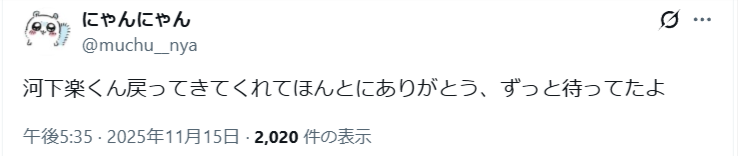 2025年11月15日に、元関西ジュニア・河下楽さんが活動再開したことを発表しました。