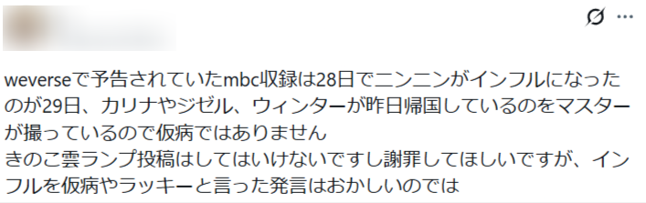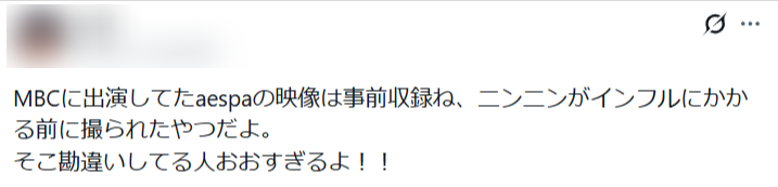 今回のニンニンさんが出演していた韓国の番組も、インフル前に事前収録した映像を放送していたとのことです。