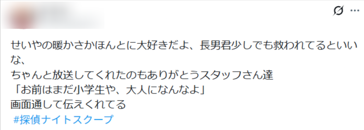 この依頼の探偵、霜降り明星のせいやさんが長男に言った言葉が絶賛されて話題になっています。
