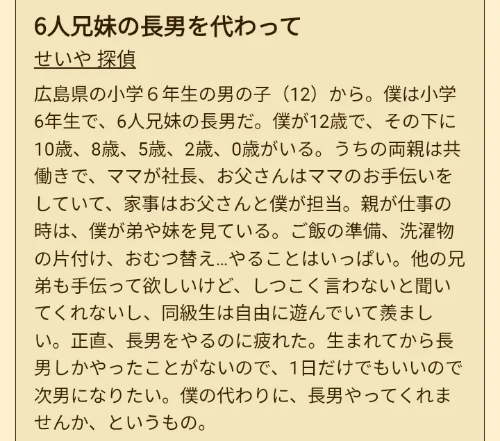 小学生の長男が共働きの両親に代わって弟・妹を見ていて、1日だけ次男になりたいという内容でした。