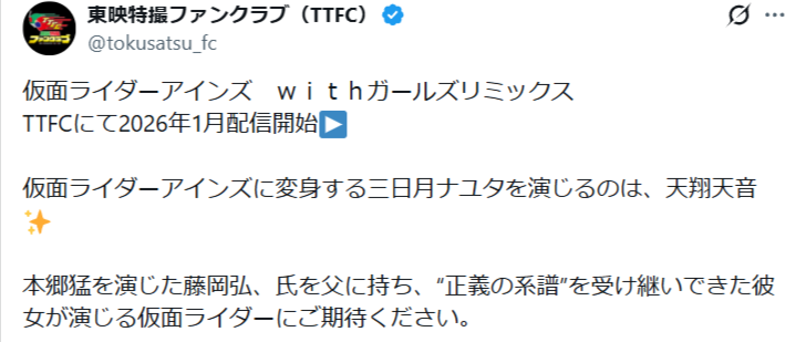 2026年1月には東映作品で、父と兄に続いて仮面ライダーに変身することが決まり注目度が上がっています。