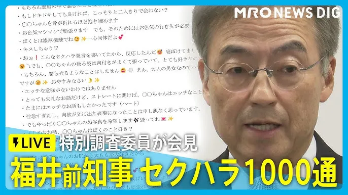 特別調査委員会の報告書によると、LINEや私用メールで約1000通のセクハラメッセージ3件の身体接触が確認されました。
