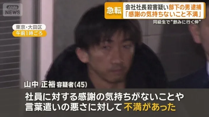 東京・大田区で、会社社長の男性を手に掛けた疑いで山中正裕容疑者が逮捕されました。 山中容疑者は勤務先の社長に対して、不満を募らせていたとされて犯行に及んだとい…